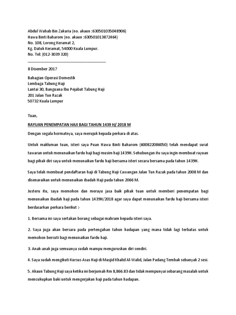 Atas permintaan ramai, di sini saya kongsikan surat rayuan untuk pergi haji yang saya hantar kepada tabung haji. 0 ratings0% found this document useful (0 votes). Namun, adalah digalakkan untuk anda mengisi borang rayuan haji yang disediakan. Savesave surat rayuan haji mak 2017 for later. Rayuan haji dibuka november ini, berikut contoh surat rayuan kepada tabung haji.